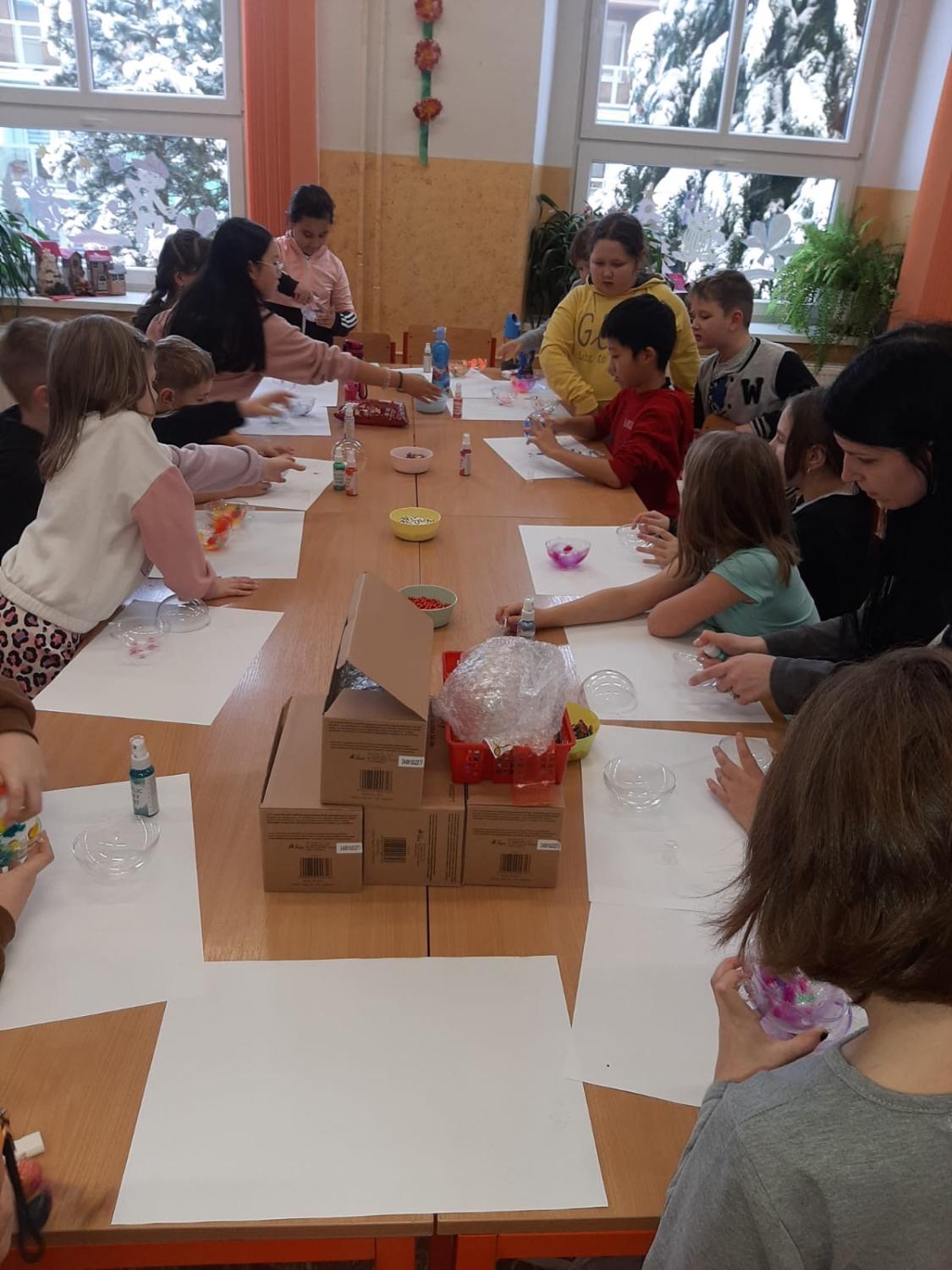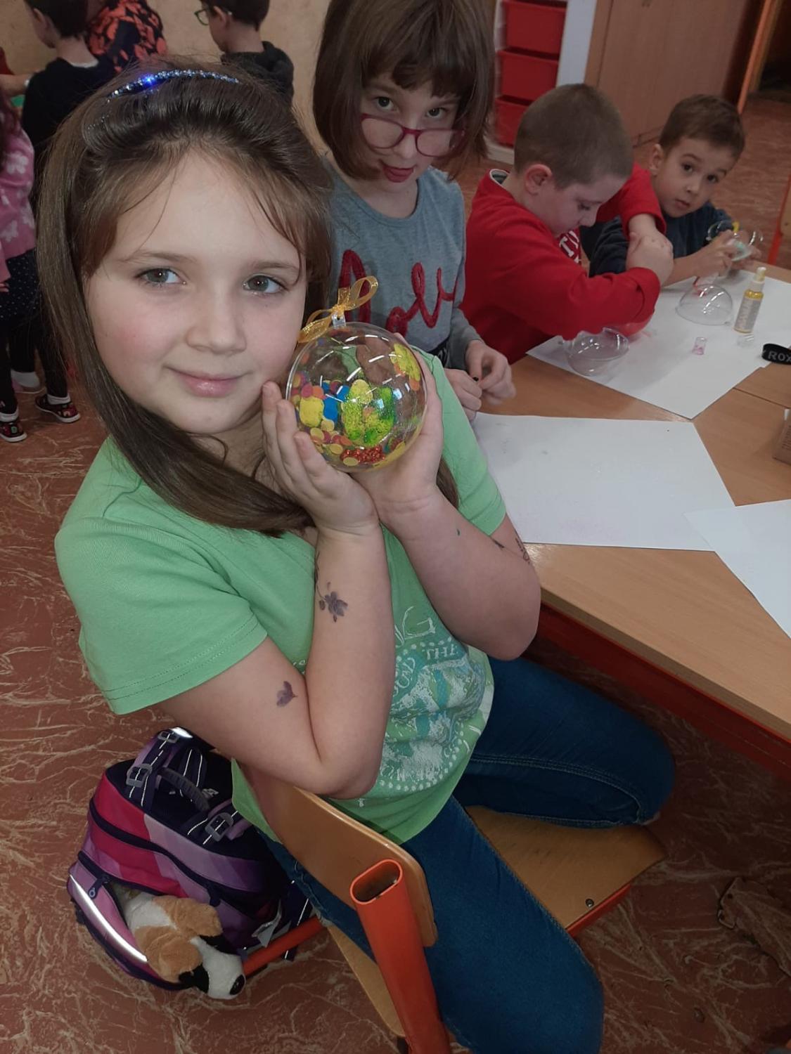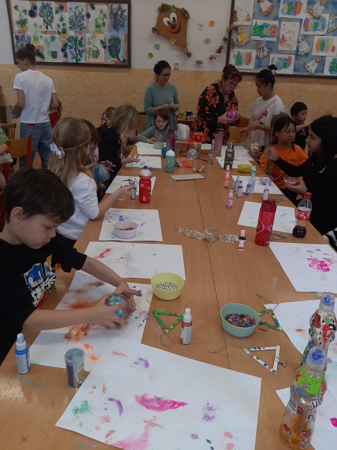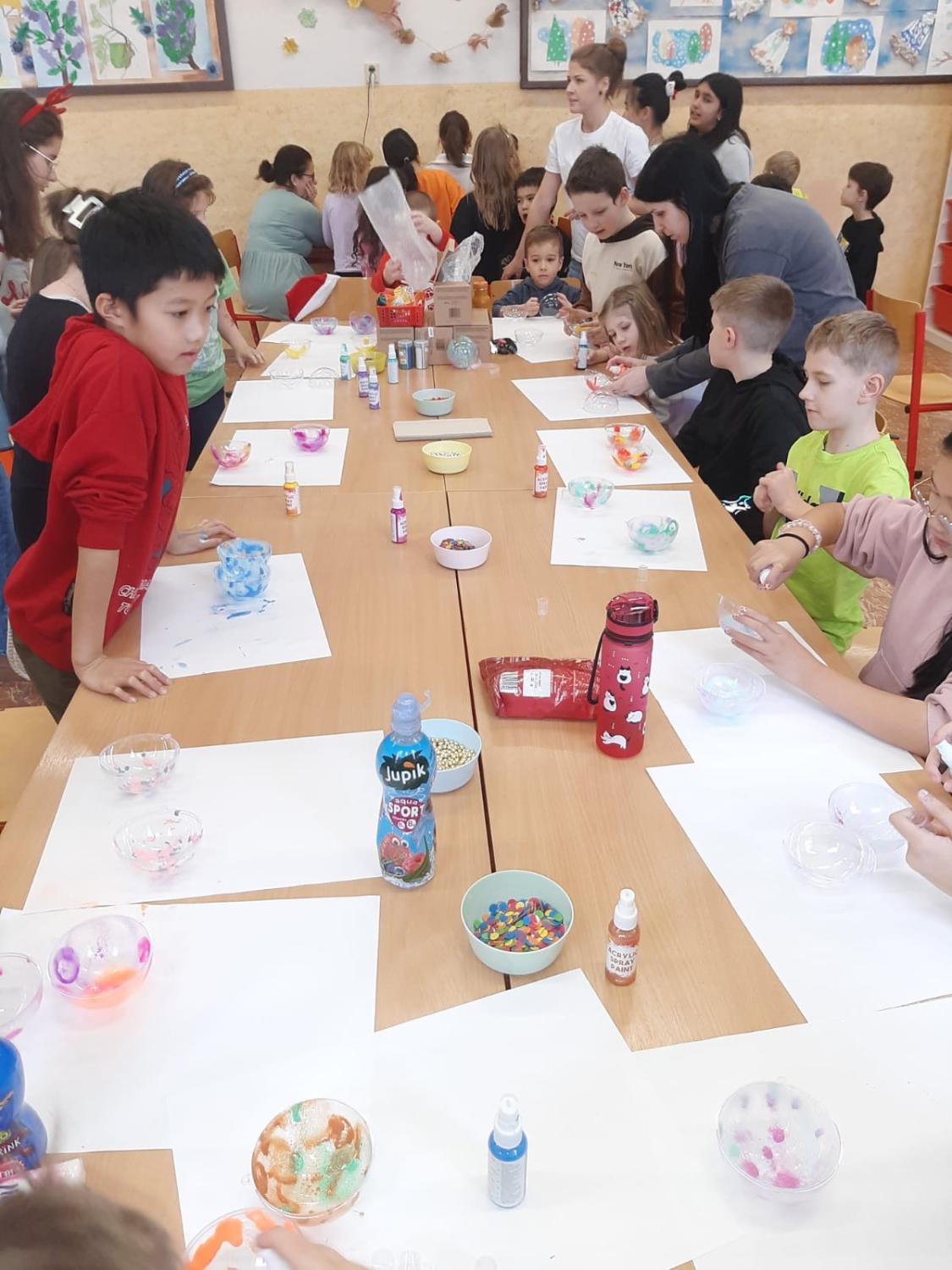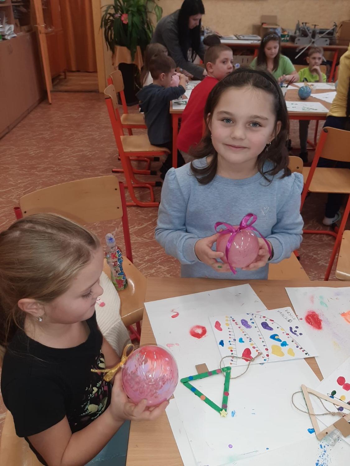 Dnes proběhla vánoční dílna pro všechny žáky 1.stupně, kde si děti za pomoci paních učitelek a asistentek vyrobily několik různorodých výrobků.