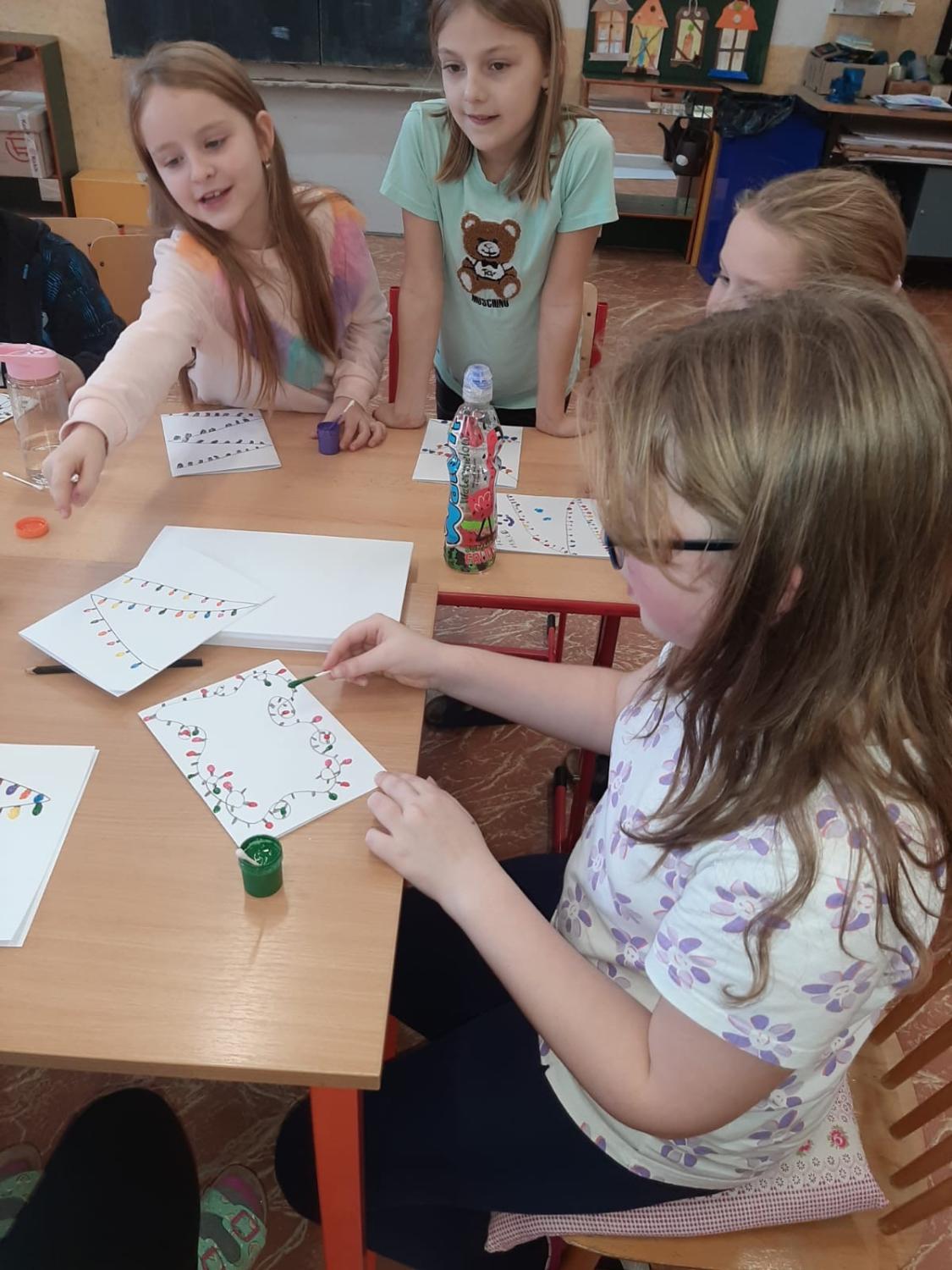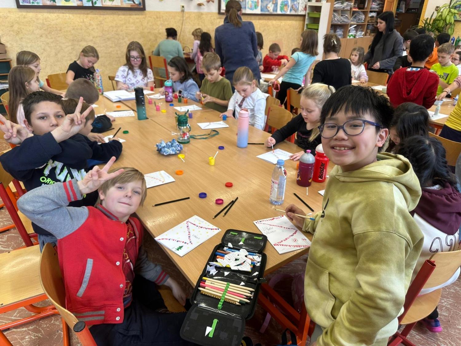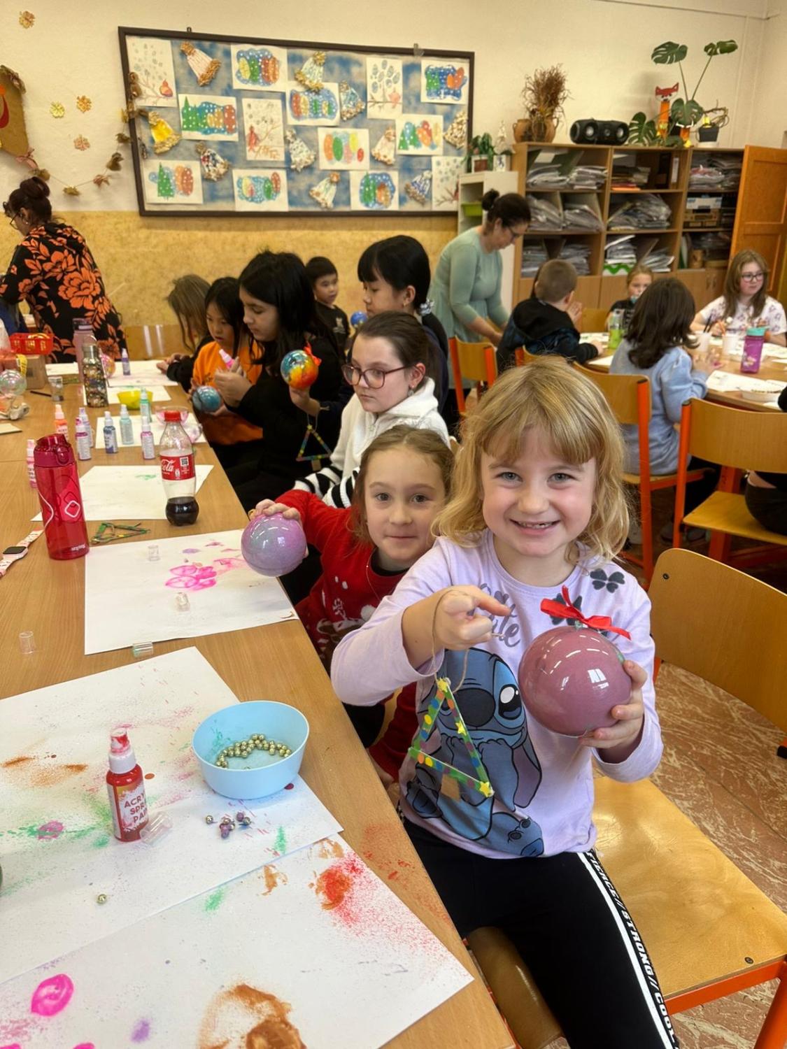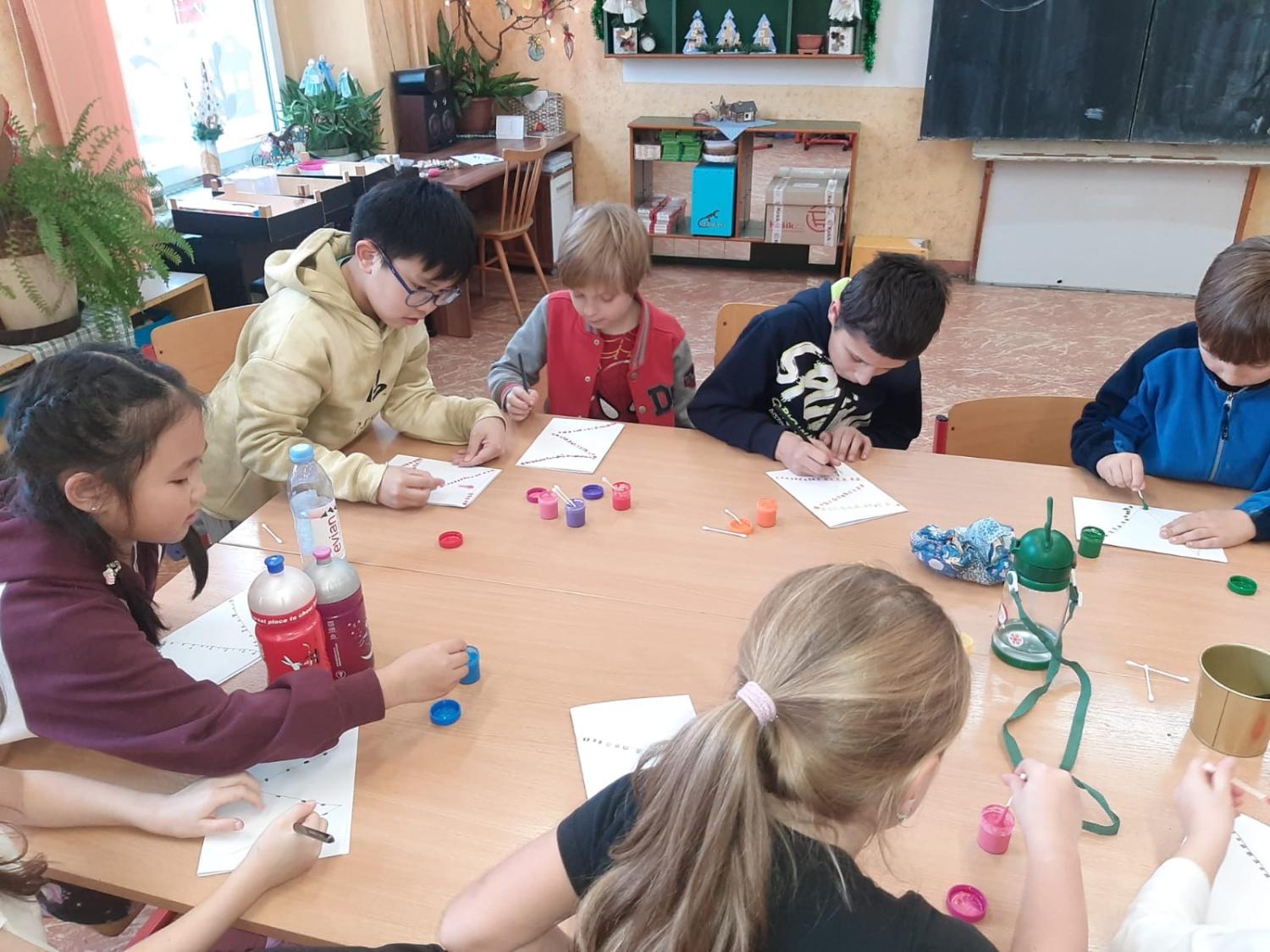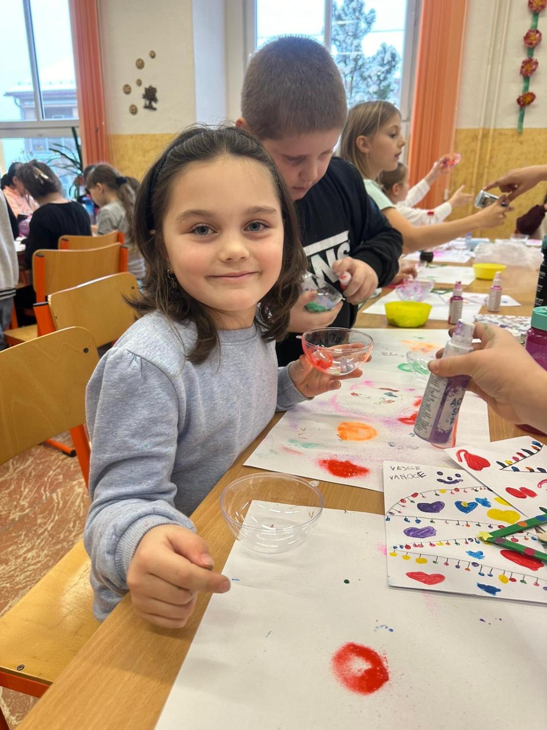 Dnes proběhla vánoční dílna pro všechny žáky 1.stupně, kde si děti za pomoci paních učitelek a asistentek vyrobily několik různorodých výrobků.